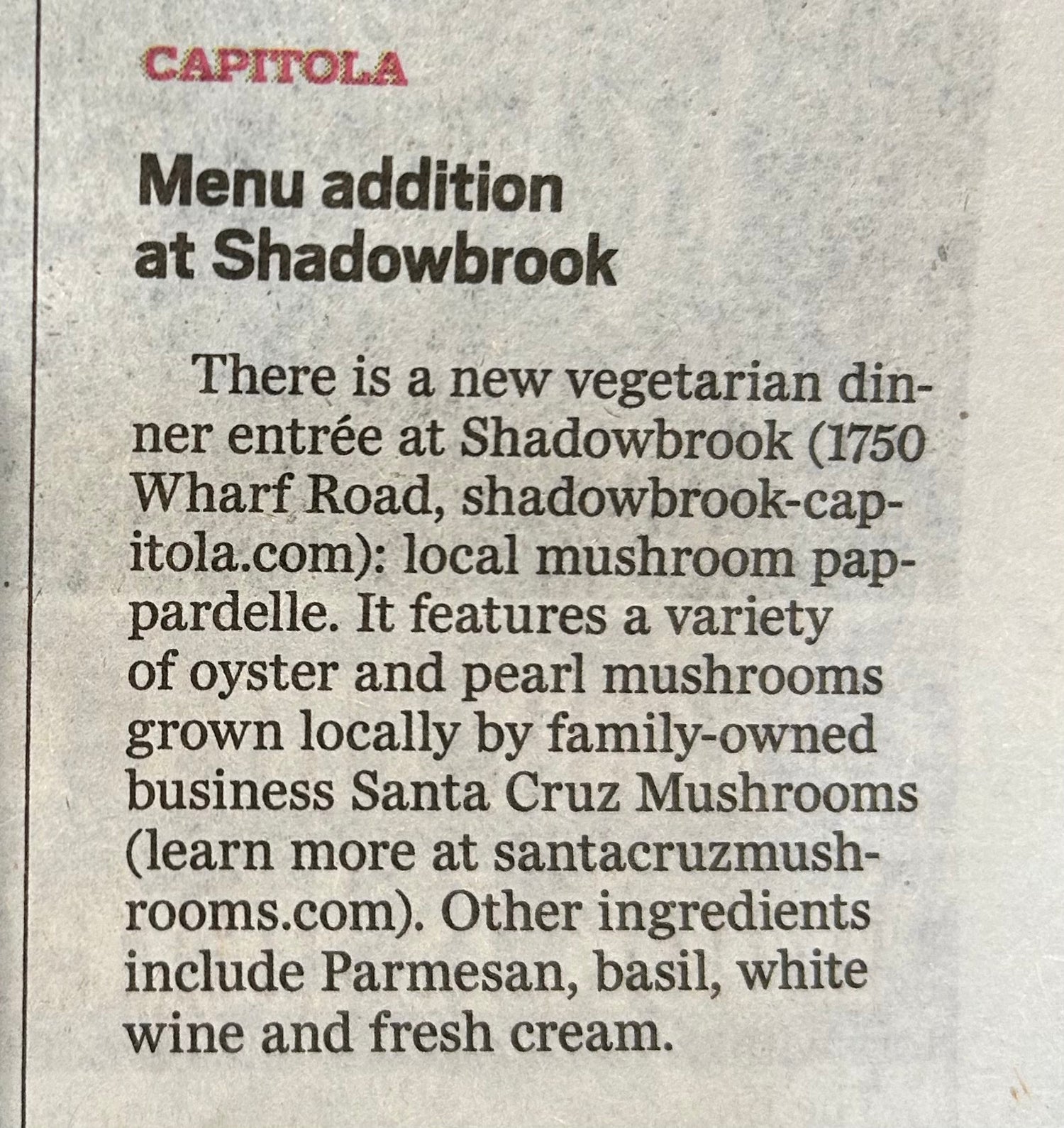 We grow beautiful mushrooms right here at our Live Oak location. Mushrooms are harvested as they mature and made available to farmstands, chefs, restaurants, and the public - fresh off the block! Keeping up with demand has been challenging, but fun! We have managed to continue expanding our capabilities without sacrificing quality. Currently serving Santa Cruz County, California.